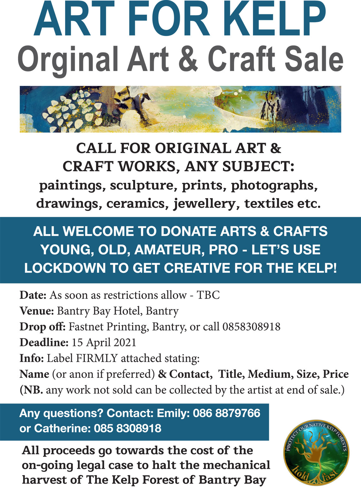 The Campaign to Protect the Native Kelp Forests of Bantry Bay will be holding a display and sale of art and craft works as soon as restrictions allow, with all donations going towards the cost of the on-going legal case to prevent the mechanical harvest of the Kelp Forest of Bantry Bay.
